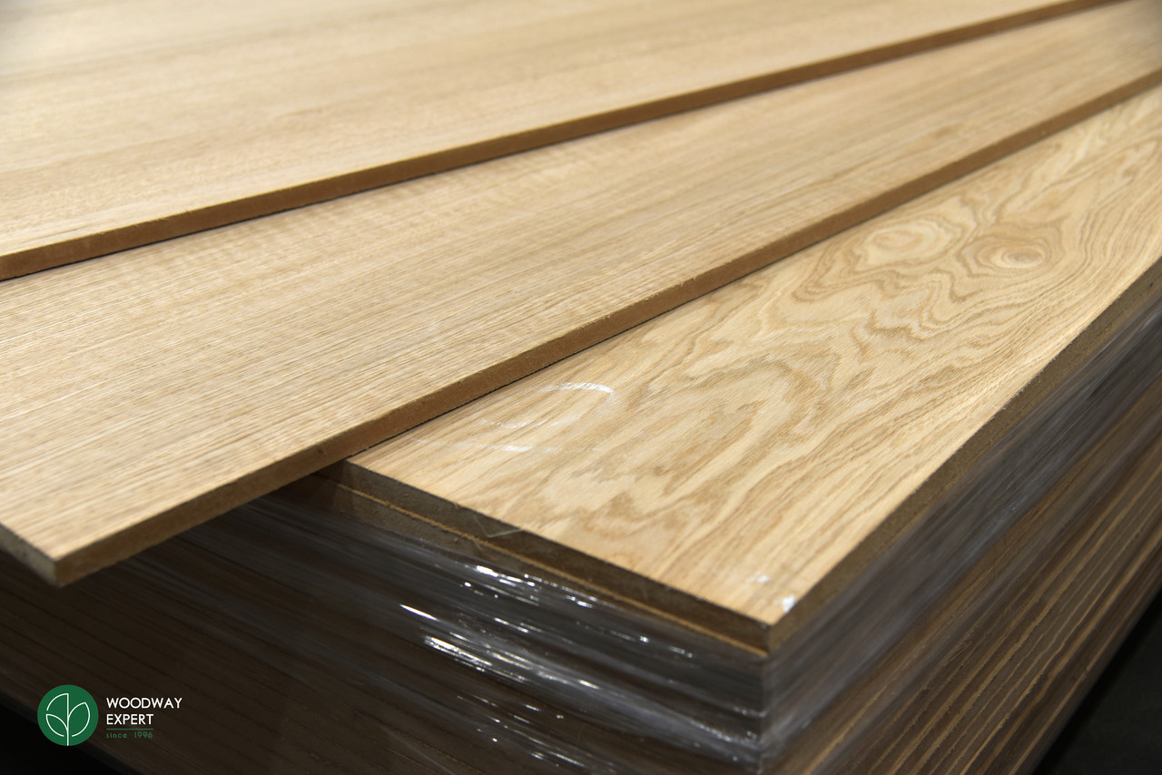 Із МДФ, шпонованого дубом, створюють настінні чи стельові панелі. Таке облицювання стін і стелі доречне в інтер'єрах кабінетів, бібліотек, а також спалень, віталень. Також із вкритих натуральною деревиною плит виготовляють двері, перегородки, поручні для сходів, карнизи та інші архітектурні елементи.
